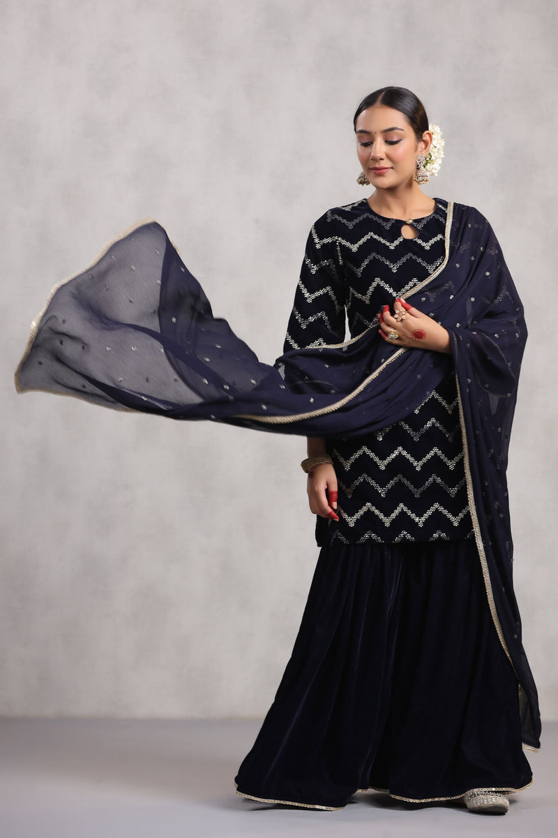 Bring luxury and style to any special occasion with Glitz Velvet Sharara Set! Made from premium Velvet fabric, this set is adorned with intricate Zari and Sequence work. Perfect for winter weddings.