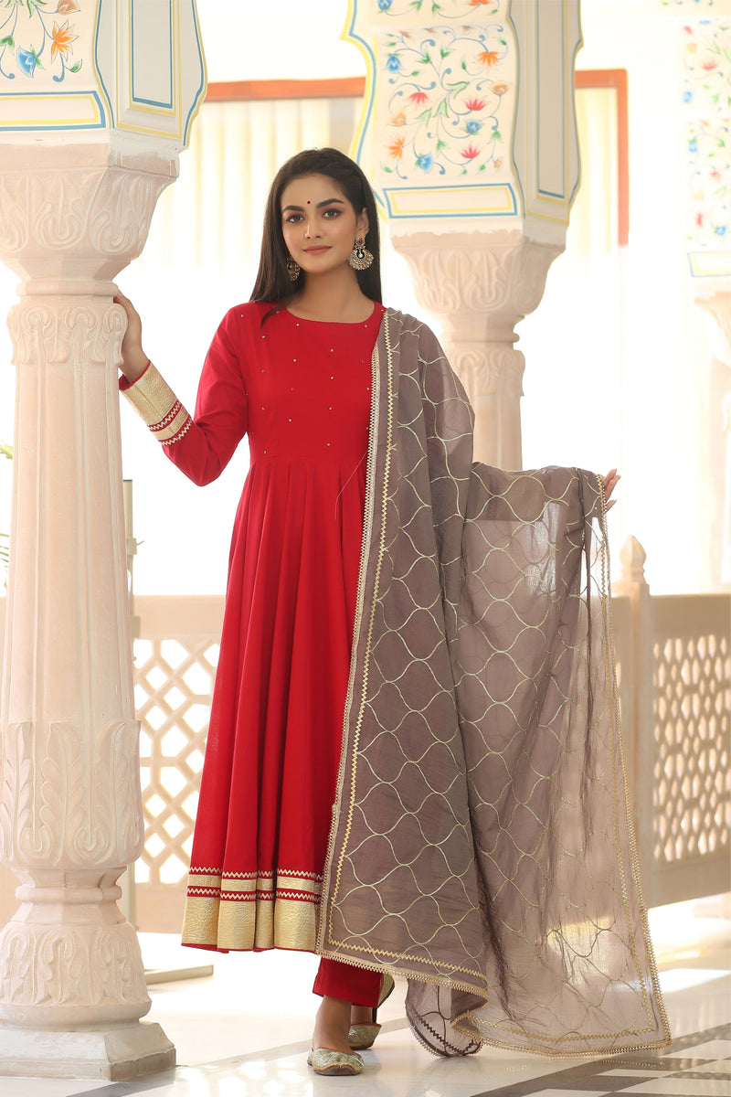Gulnaaz Anarkali with Dupatta is the perfect choice for a statement-making look. This anarkali suit set is crafted with super soft cotton, featuring a full flared long Kalidar Kurta with zero neckline, full sleeves, pencil pant, and a fine Gota Mughal Jaal work on the dupatta. The neckline is adorned with intricate Gota border and the bottom hem and sleeves are sequenced with intricate Gota border. The dupatta is made from super fine cotton and will be sure to turn heads. This anarkali kurta set with dupatta set is the perfect choice for a glamorous and sophisticated look.