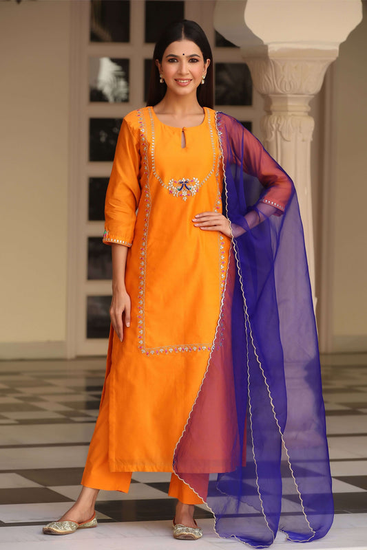 Beautifully crafted Kurta using Pure Chanderi fabric with intricate Handwork teamed with scalloped pure Organza Dupatta. This outfit will give you that Wowwww... feel.