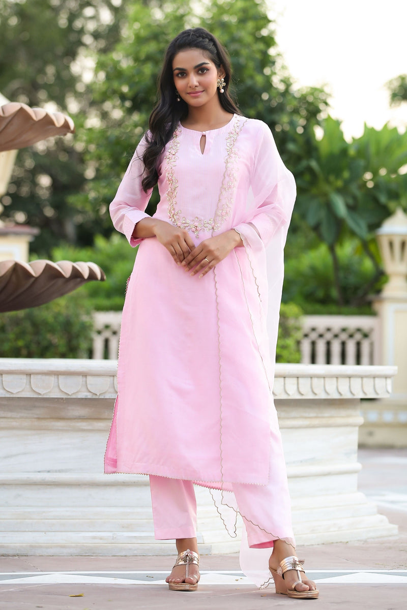 Enhance your wardrobe with this stylish, hand-embroidered Lilac Pink Pure Chanderi Suit Set. This stunning set features a straight kurta with intricate zardozi, knot work and zari stripes on the yoke, matching pencil pants, and a pure organza dupatta with scalloped edges. The rose work and zardozi adorning the set make it perfect for any occasion – its unique design and quality fabric make it a great choice for any modern woman. Wear this beautiful chanderi silk suit set and make a statement!