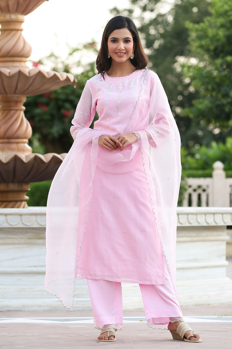 Silver sequence Hand Embroidery on Pure Chanderi fabric, teamed with Pure Organza dupatta makes it must have outfit this festive and wedding season.