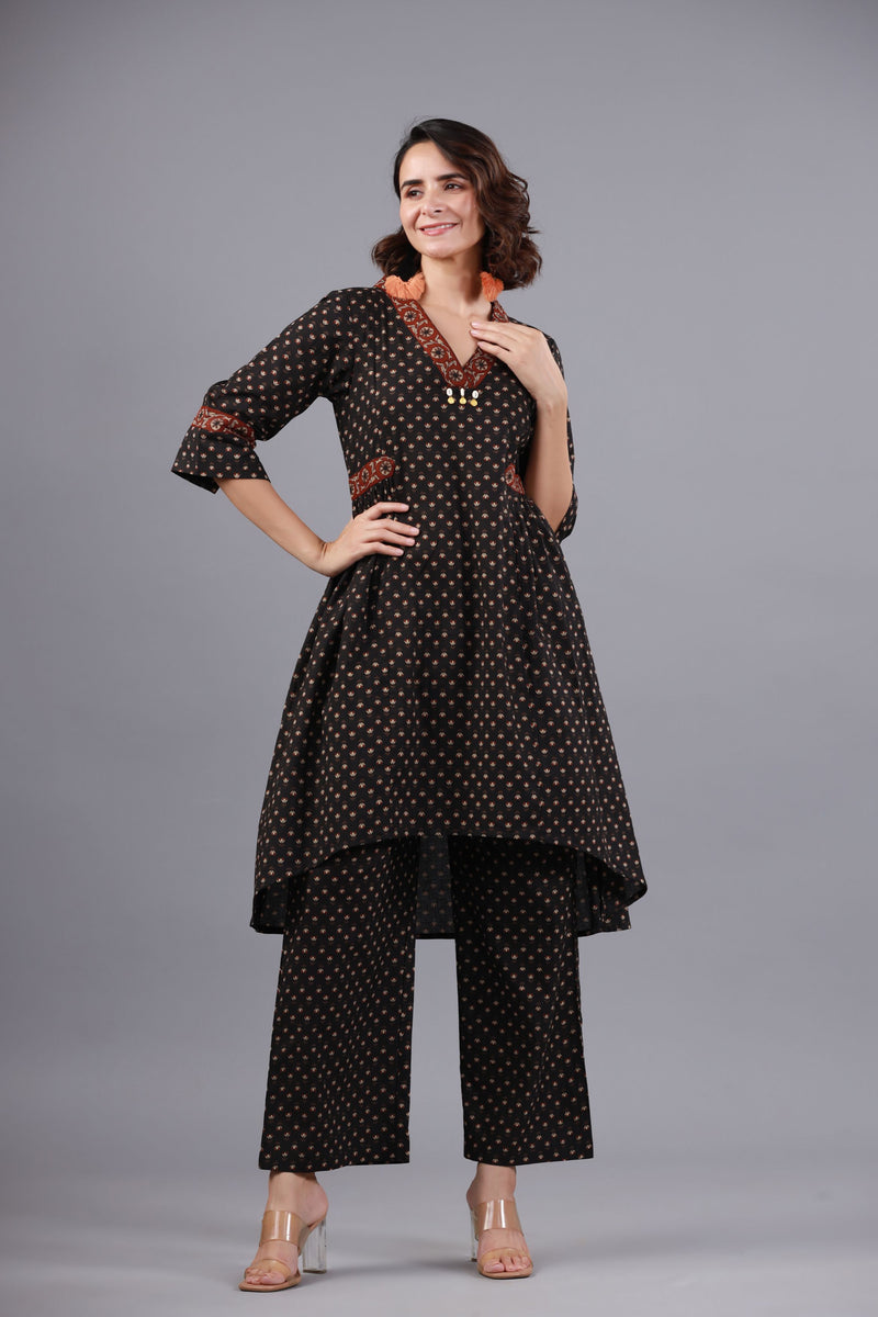 Enhance your style with the Black Sanganeri Printed Kurta Pant Set, featuring a sophisticated Jaipuri Sanganeri print and premium Cotton fabric for ultimate comfort.
