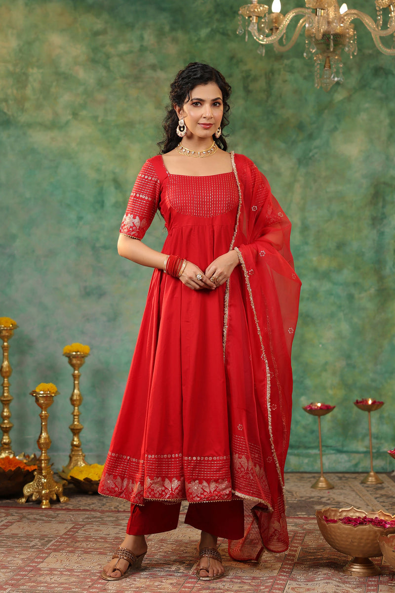 | Kurta Style | Pure cotton Vermillion Red kalidaar kurta embellished with hand block gold printed borders and beeja on hemline yoke and sleeves. |
