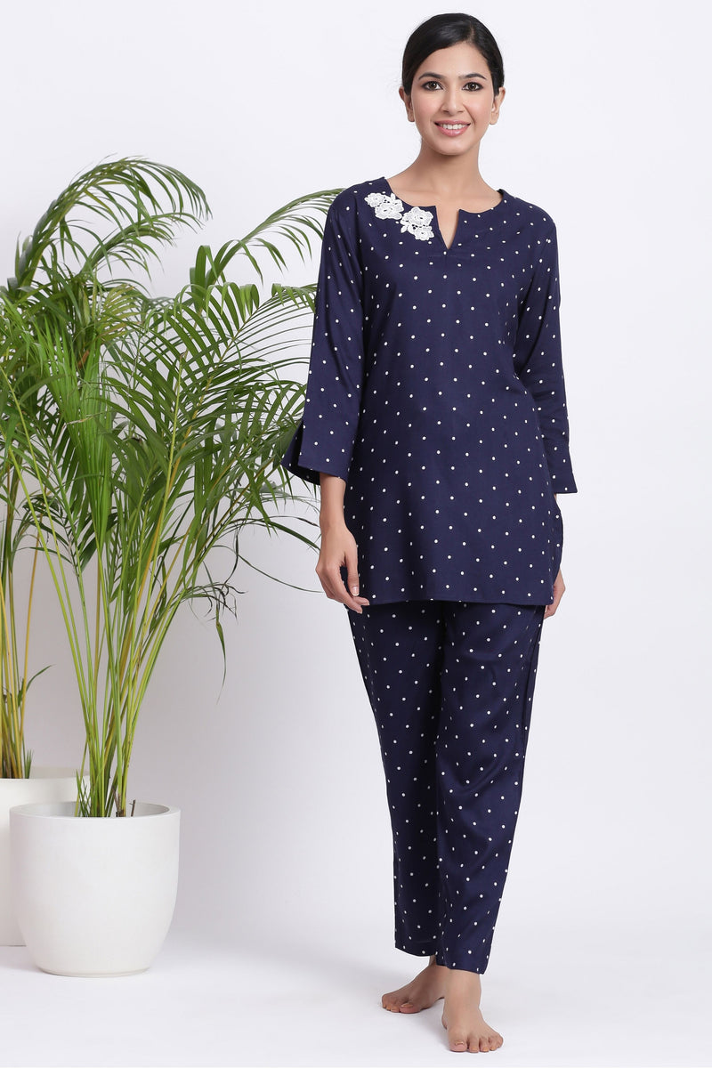 Our Playful Polka Loungewear Set is essential for everyday lounging. The charming polka print adds a fun touch of personality. Whether you're looking for something comfortable to wear while watching movies or to just relax at home, this rayon loungewear set provides the perfect combination of function and style. The rayon fabric is breathable and durable, making it an ideal choice for any day of the week. Enjoy the playful and comfortable vibes of our loungewear set, and make it your go-to piece when you want to relax.