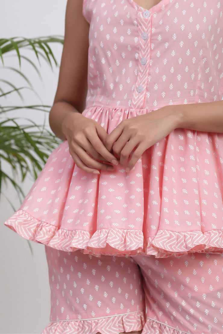 Add a touch of femininity and style to your wardrobe with our Queen of Hearts Short Set. This beautiful two-piece set is crafted from light cotton fabric in a soft peach hue. The top features a sleeveless design with a round neckline, ruffle detailing along the neckline, and a ruffled hemline. The shorts feature an elasticated waistband and a ruffle-trimmed hemline for a delicate finish. The airy and lightweight fabric is perfect for hot summer days, while the feminine colour and design make it a great option for any occasion.