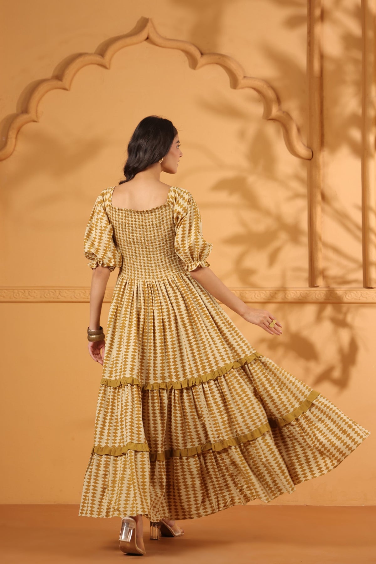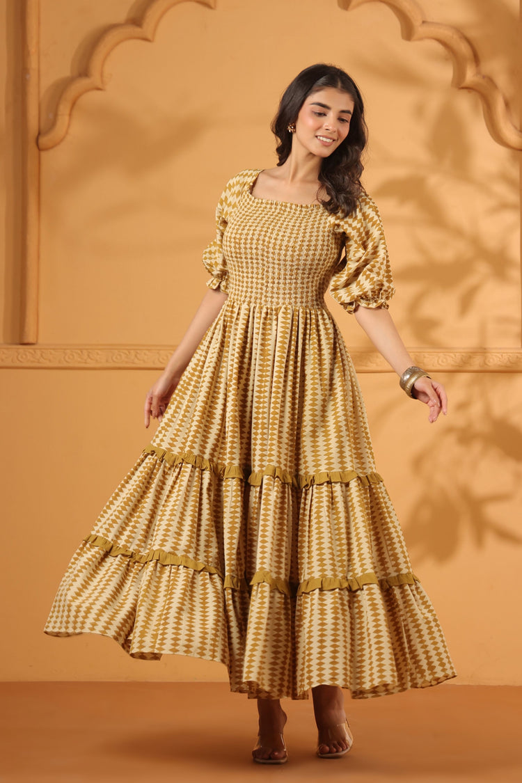 | Dress Style | Pure cotton bagru printed flared tiered Dress with square neck. Elasticated front and back yoke. Elasticated puff sleeves. Tiered finished with contrast colored fabric frills to add grace. |