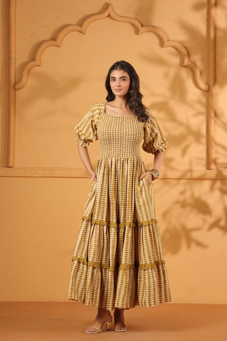Enjoy all day comfort and style with this Bagru Block Printed Tiered Dress. Crafted from pure cotton, this ankle-length flared dress features a charming square neckline, elasticated puff sleeves, and tiered layers finished with contrast-colored fabric frills. The elasticated front and back yoke ensures a comfortable fit, while two side pockets add practicality. Perfect for casual wear, this traditional block print artistry with contemporary silhouettes for effortless everyday elegance.