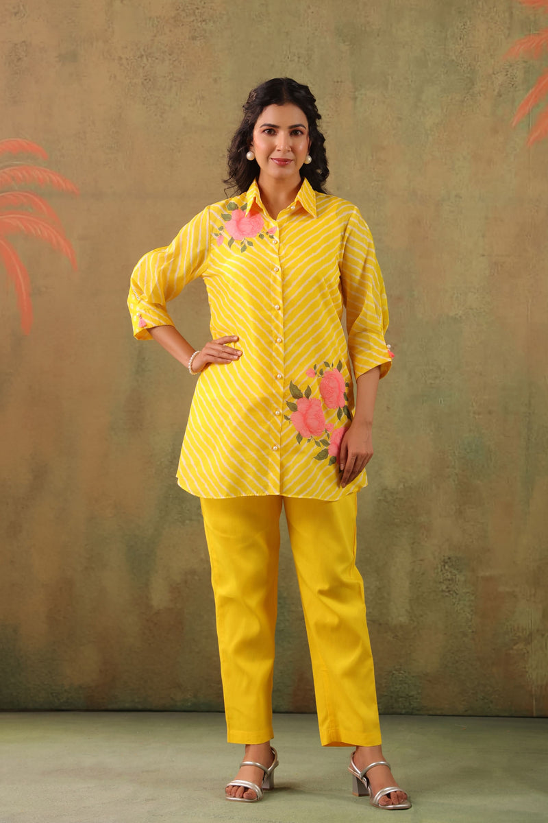 Add a splash of sunshine to your wardrobe with the Basanti Shirt Style Leheriya Co-ord Set! This playful ensemble features a vibrant Chanderi leheriya print shirt adorned with charming floral patchwork, paired with soft premium cotton innerwear and comfy pants. Perfect for those who love to celebrate life in colourful, carefree style while staying effortlessly comfortable.