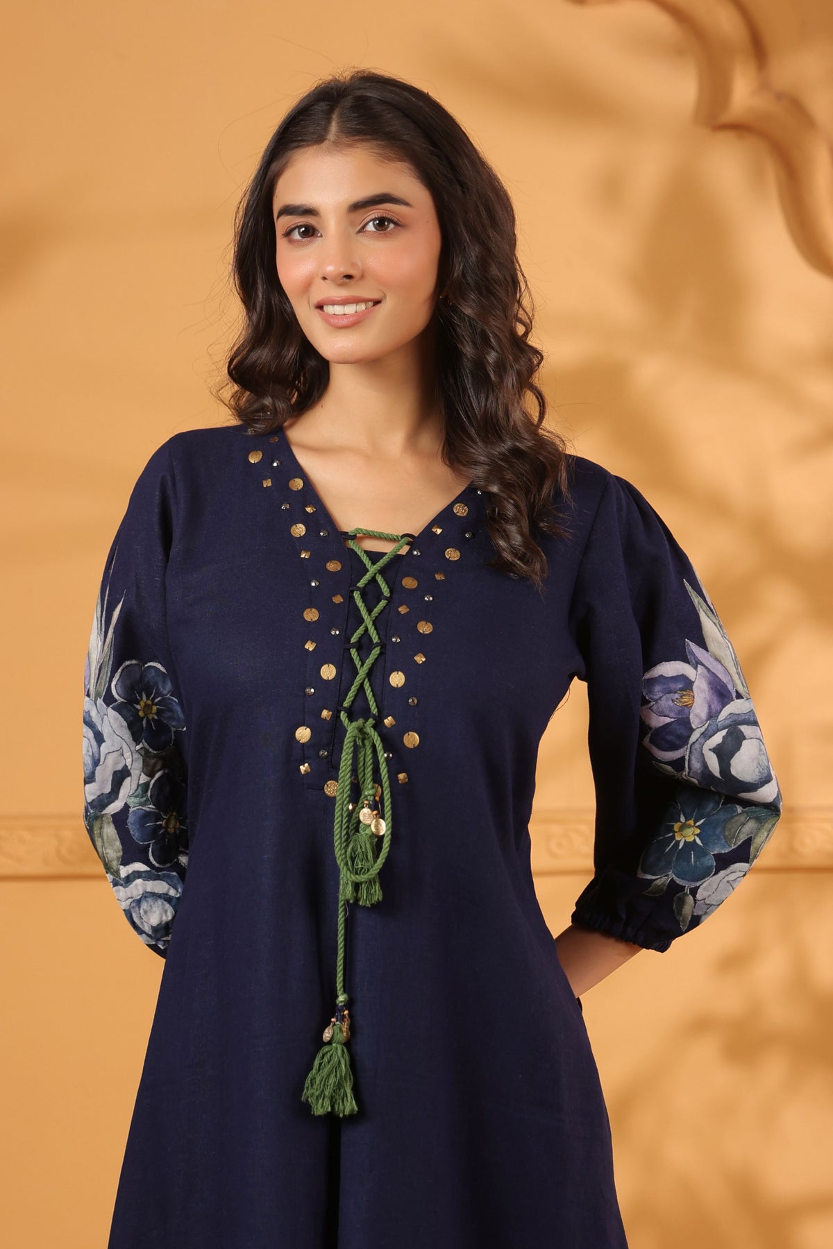 | Dress Style | Linen blended Cotton A line Kurta with elegant floral printed patch work at sleeves.. Neckline embellished with coin work and drawstrings. One Side pocket |