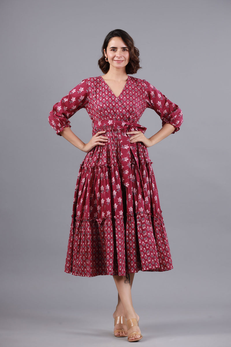 Stay all day comfortable and stylish with pure cotton Sanganeri printed tiered dress. Angrakha pattern yoke embellished with contrast printed belt makes it more stylish.