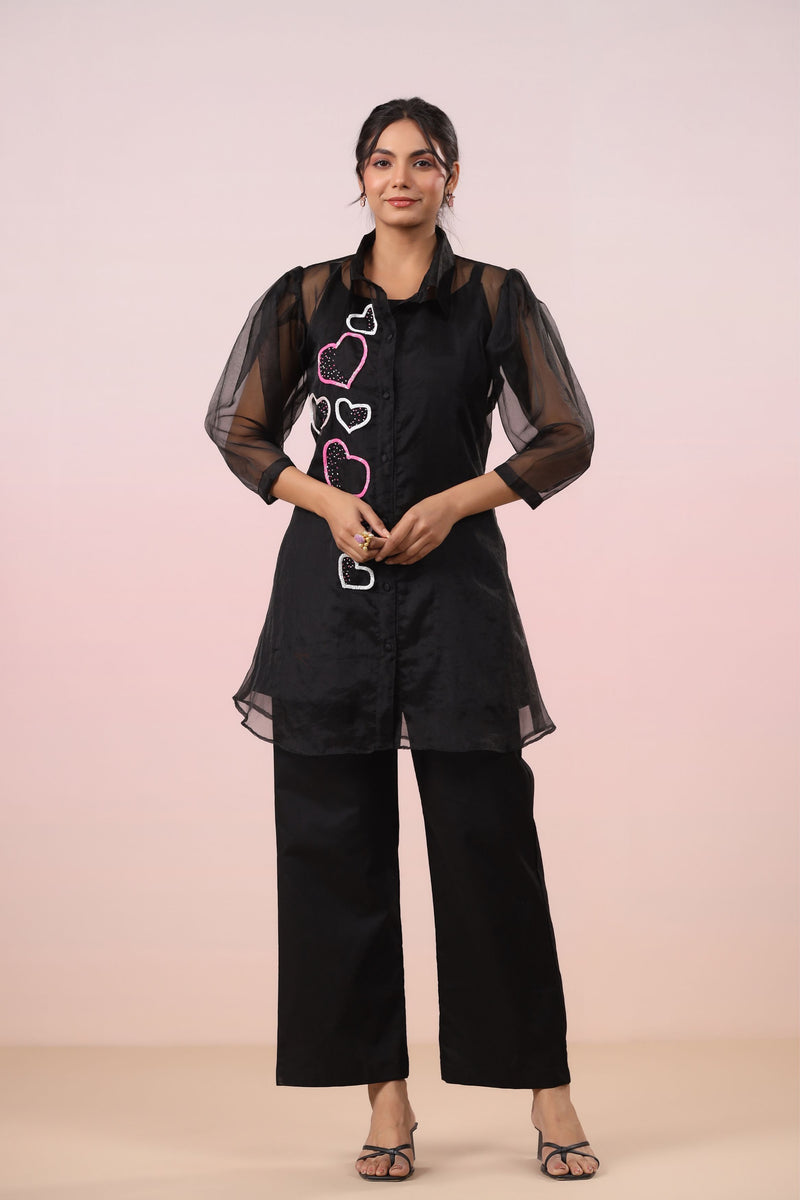 Turn heads in the Dreamy Black Co-ord Set! This designer outfit features a collared shirt adorned with hand-embroidered heart motifs, adding a touch of one-of-a-kind charm. It's the ultimate outfit for parties or a romantic date.