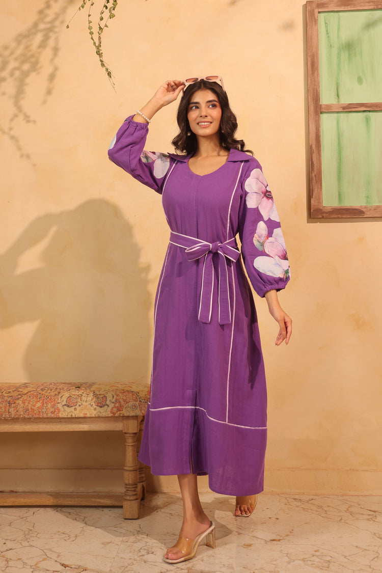 Effortlessly elegant, the French Violet Patch Work A Line Dress is your go-to piece for any occasion. Crafted from soft mul cotton double cloth, this calf-length dress features a flattering A-line silhouette with a coordinating belt for a polished look. Whether you're dressing up for a festive event or keeping it casual, this versatile dress transitions seamlessly from day to night.