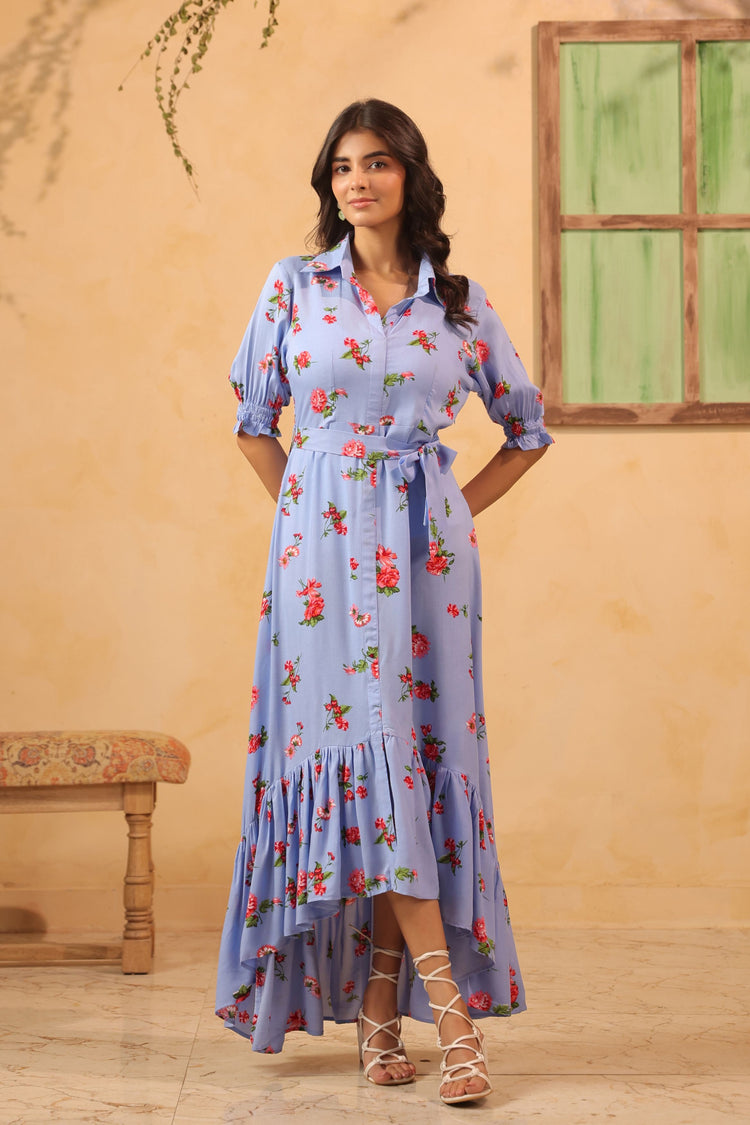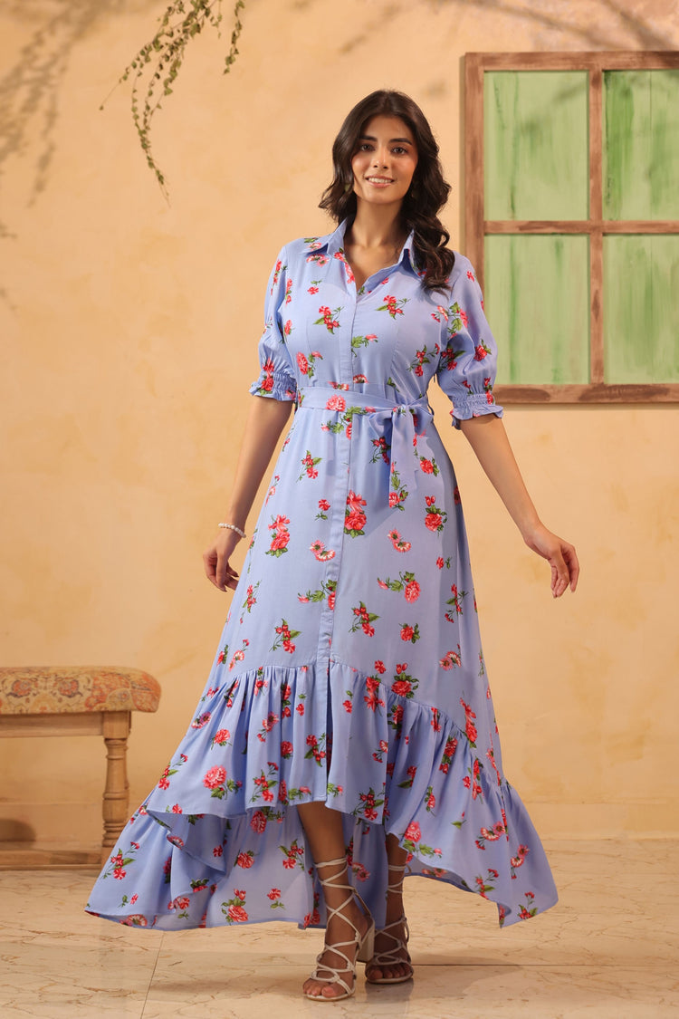 | Dress Style | Rayon A Line tiered Dress with high low hemline. Shirt collar front placket and elasticated puff sleeves. |