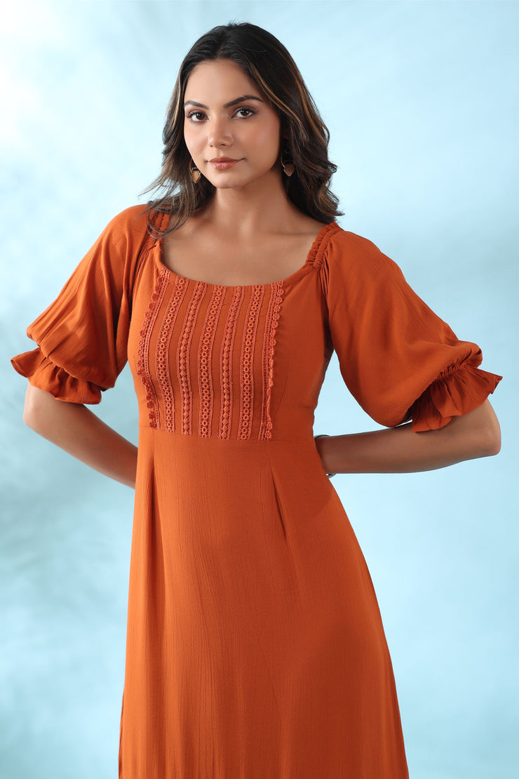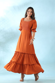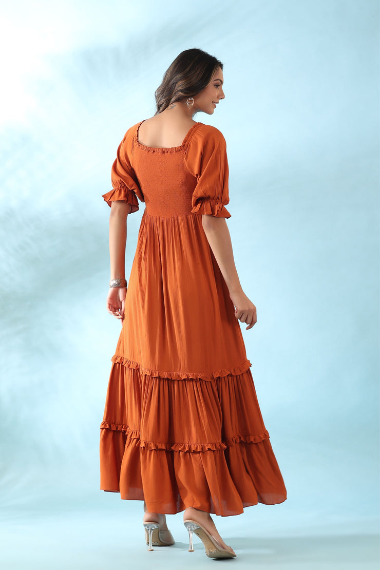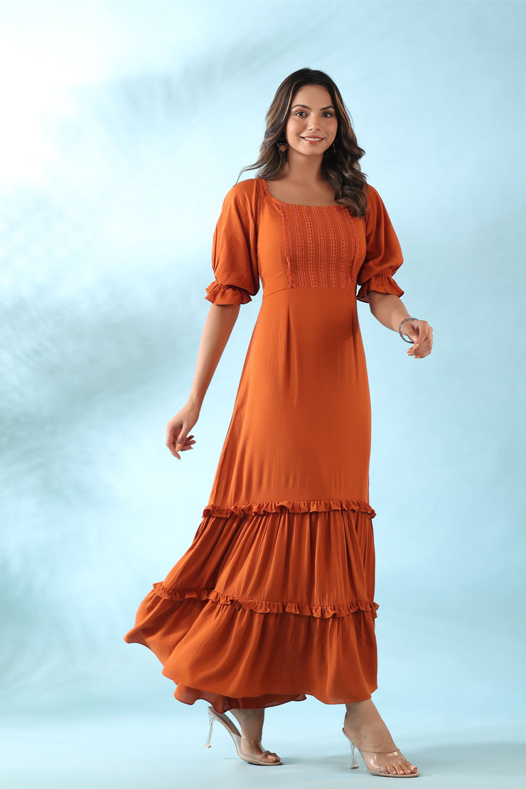 Embrace sophistication and make a fashion statement with this exquisite rust tiered dress. This trendy dress features a stunning rust color that is sure to turn heads, while the thoughtful placement of laces, inserted frills, and tiers sets it apart from the rest. Made with high-quality rayon crepe fabric, this ankle-length dress exudes elegance and style. The tiered design, complemented by the inserted frills, adds a touch of femininity to the overall look. The elasticated back ensures a perfect fit, making it comfortable to wear throughout the day. Whether you're attending a special occasion or simply want to elevate your everyday style, the rayon ankle length rust tiered dress is the perfect choice.