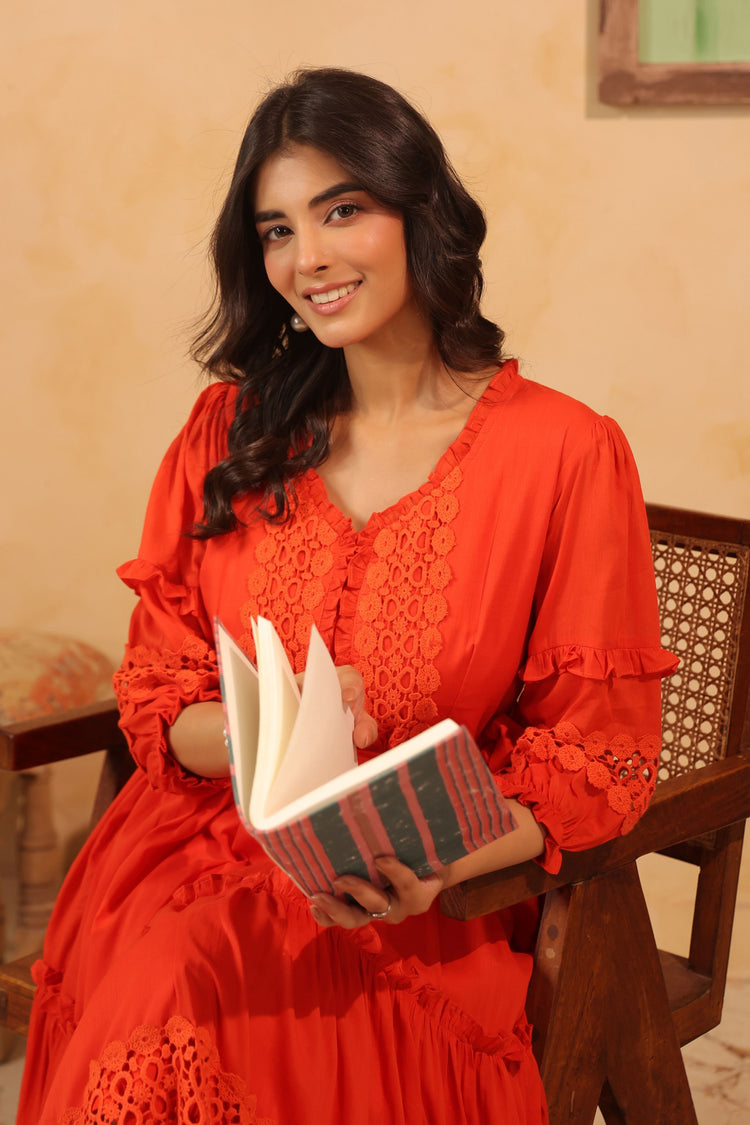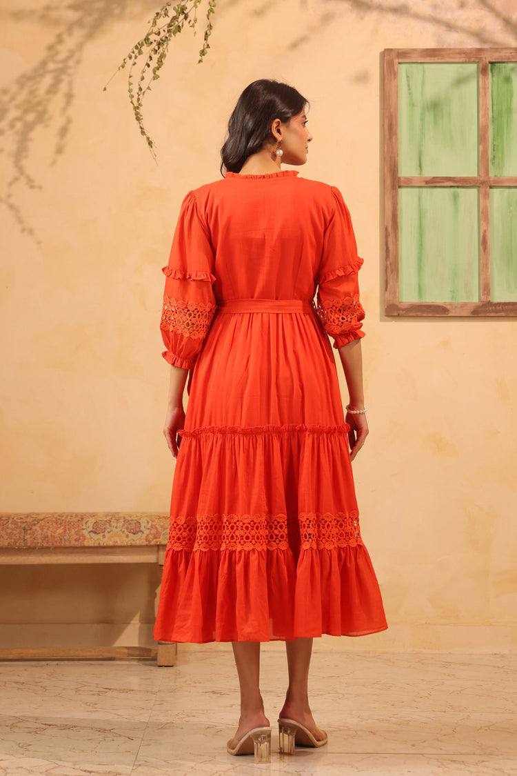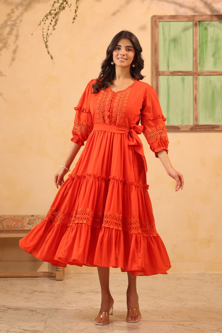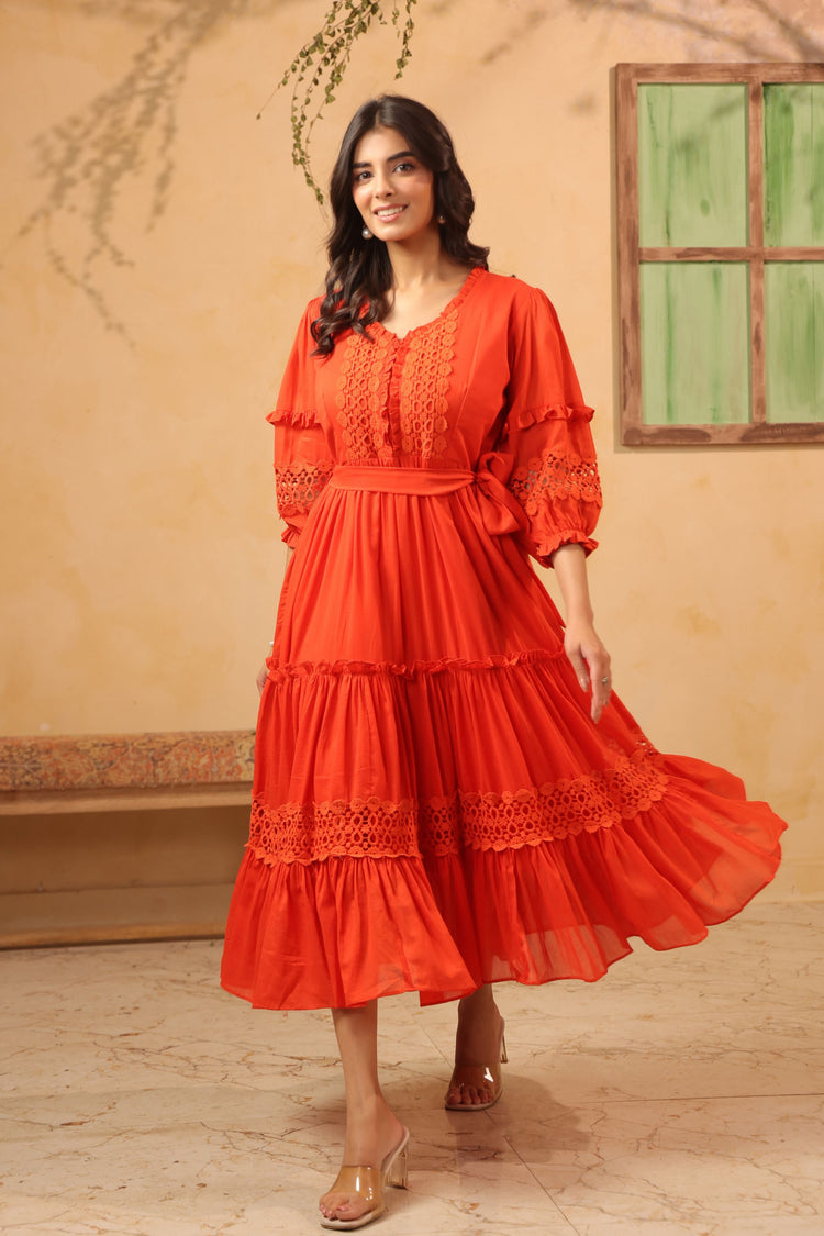 Get ready for happy vibes and broad smiles with Sienna Flared Tiered Dress. This charming one-piece calf-length dress features pure mul cotton with delicate hakoba lace embellishment. The sweetheart neckline is finished with frills and lace detailing, while elasticated puff sleeves add a playful touch. A tie-up belt gives a perfect fit.