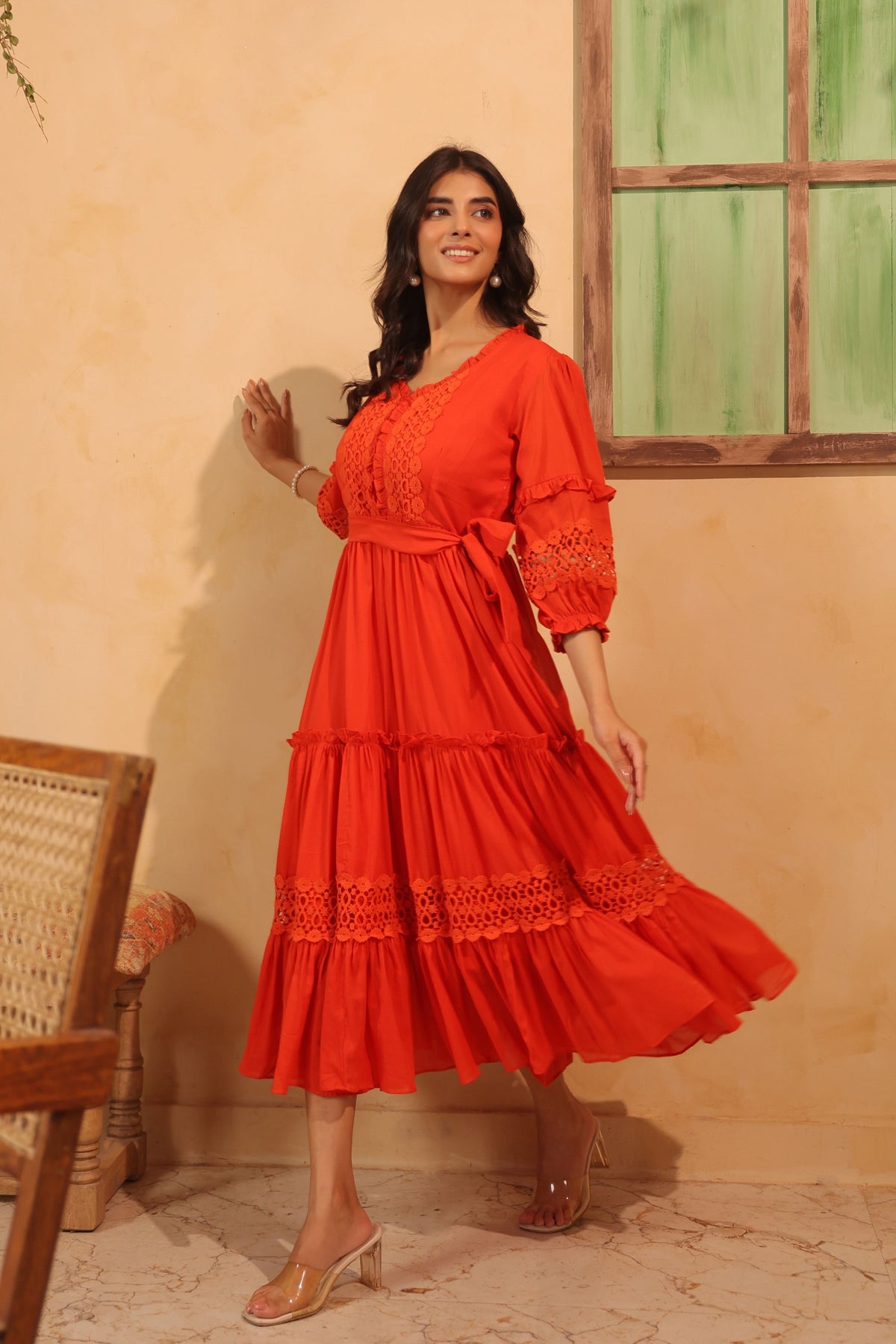 | Dress Style | Pure Mul Cotton flared tiered Dress with hakoba lace embellishment and elasticated puff sleeves. Sweetheart neck finished with frills and hakoba laces. Complete the look with tieup belt on waist. |