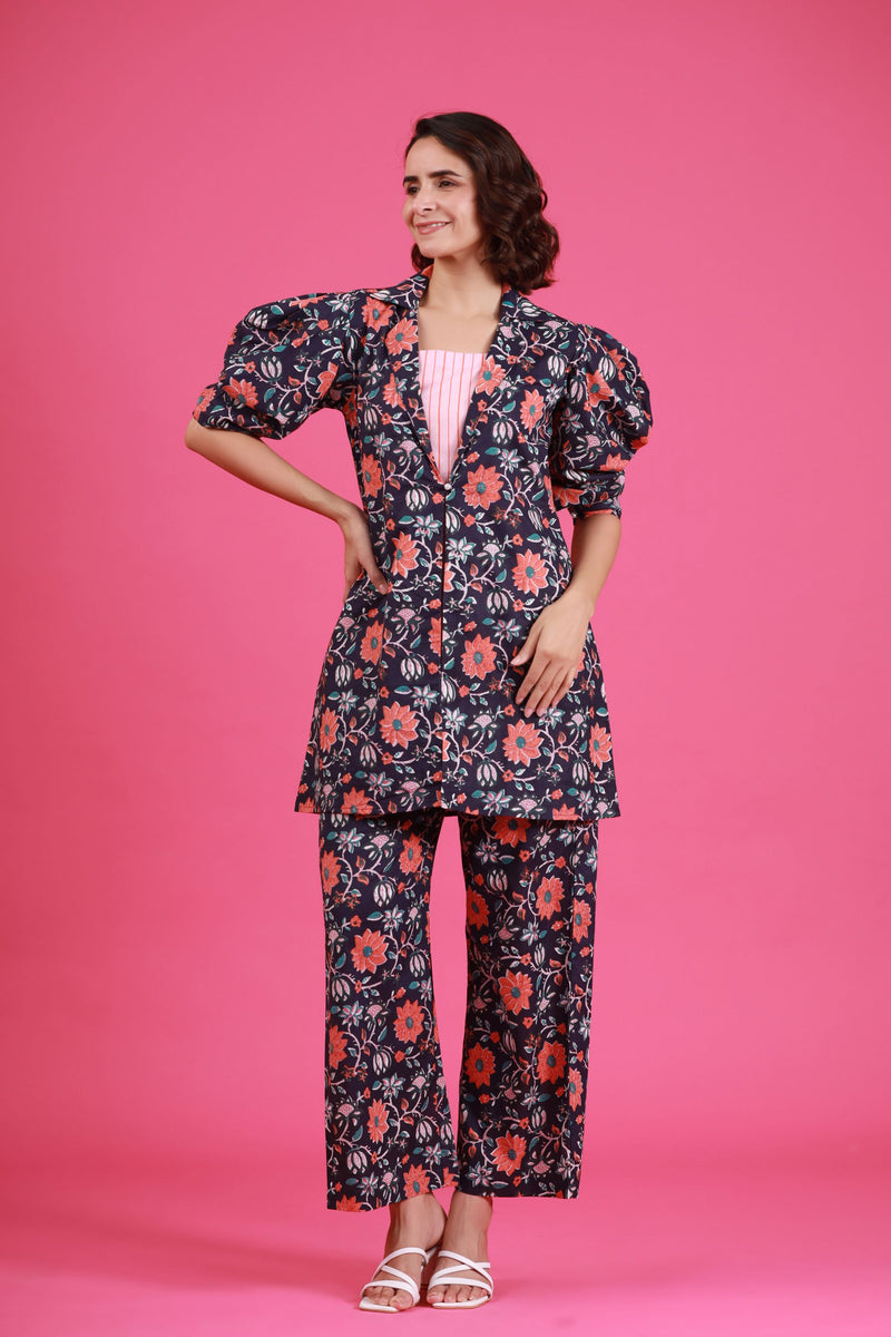 Get ready for office meetings or casual get togethers with the stylish and comfortable Passion Flower Jacket Style Co Ord Set. Made with pure cotton fabric, this set is perfect for all-day wear. Be effortlessly chic and comfortable at the same time!