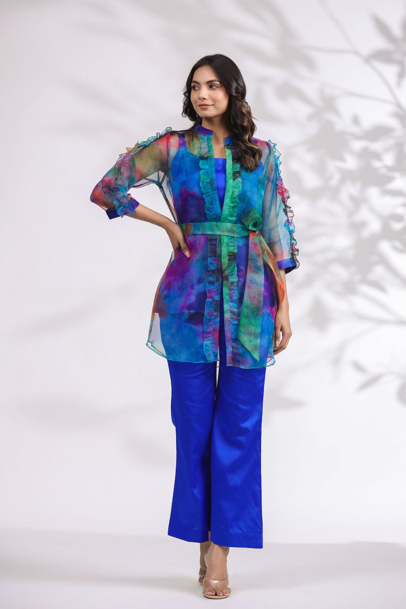 Be the star of the show with the Colour Pop Blue Co-ord Set. A bold, vibrant organza jacket paired with comfortable cotton satin pants and an inner layer for a fun and playful vibe. With added frills and a belt, this set is both stylish and trendy.