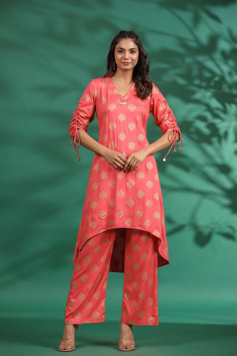 Elevate your fashion at festivals and get-togethers with the Chand Peach Kurta and Palazzo set. Made of Gold Printed Rayon fabric and adorned with coins and ruched sleeves, this outfit will keep you stylish and comfortable all day long.