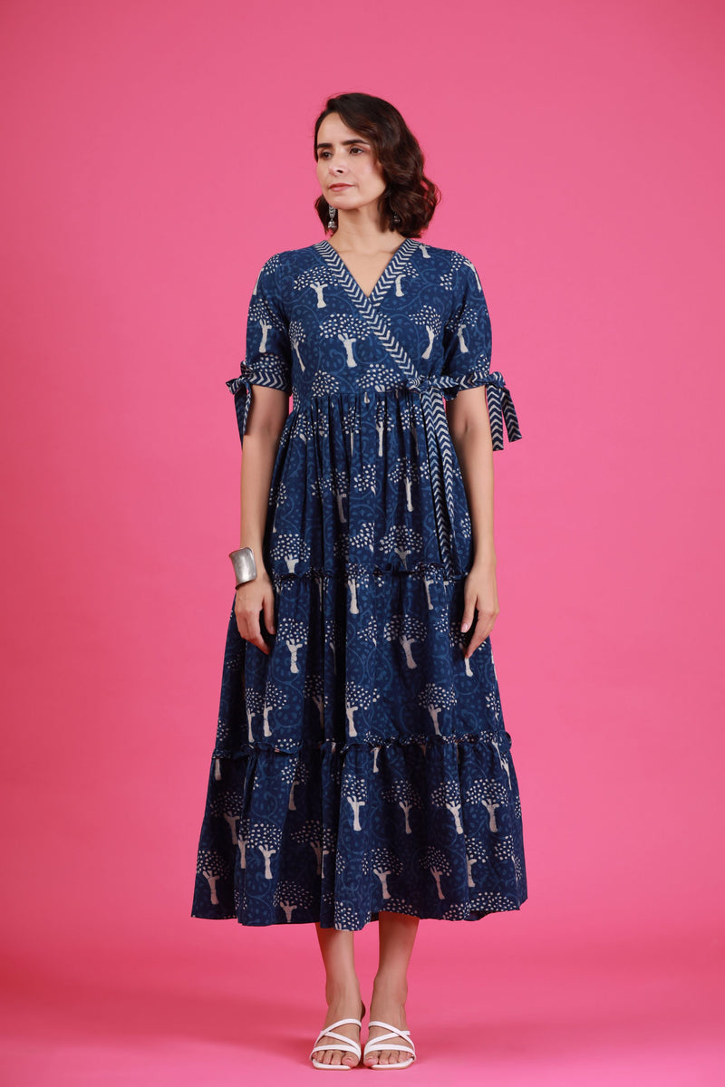 Dress style Pure cotton handblock indigo tiered dress. Angrakha pattern yoke embellished with contrast printed taping and side belt for better fit.