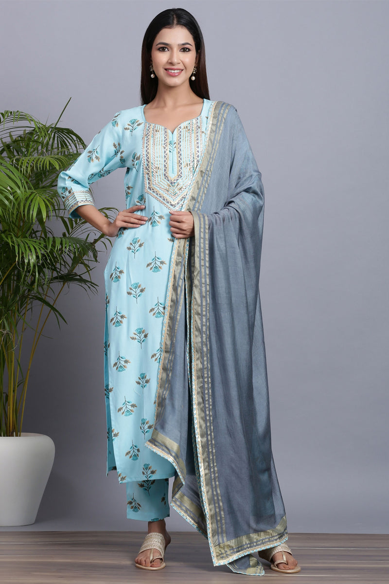Colour Kurta set - Aqua Blue, Dupatta - Smoke Grey