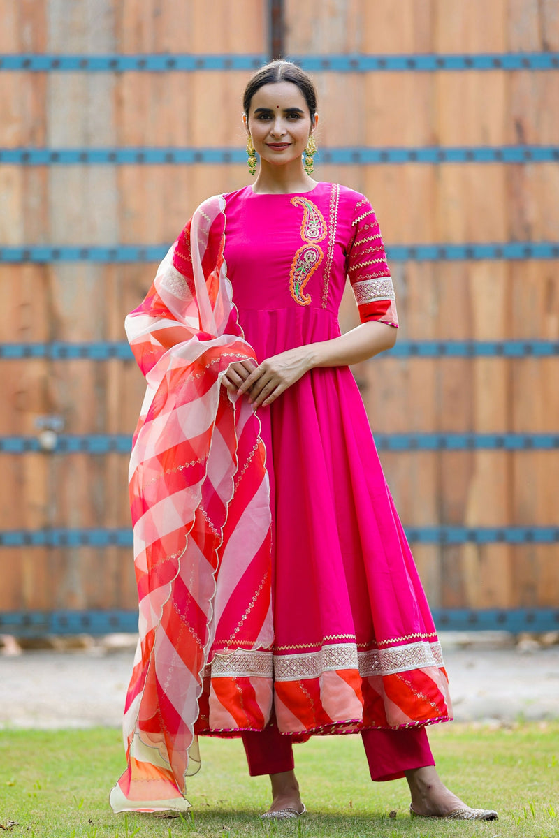 Beautiful Rani colour Pure Cotton Anarkali embellished with Gota, Thread, and Pearl embroidery gives a stunning festive and party look. Gold Printed Leheriya Dupatta adds charm to it.
