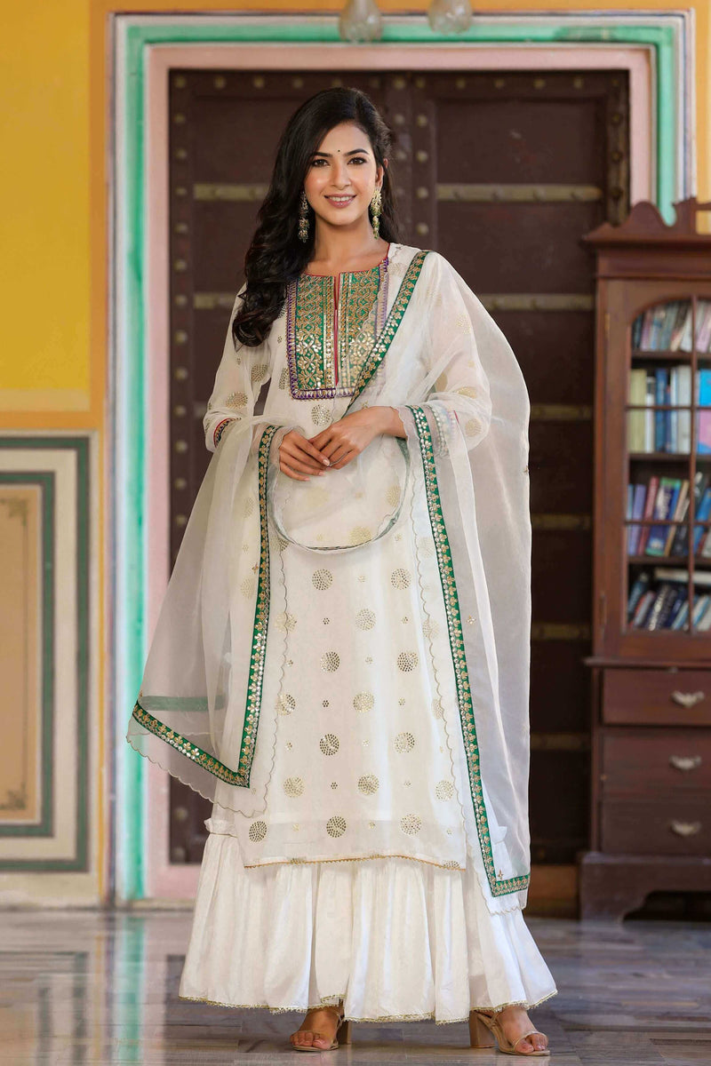Look drop-dead gorgeous as you head out to your next soiree flaunting this stunning white party wear sharara suit set. The straight georgette kurta with foil print motifs paired with Santoon silk sharara gives you an elevated look. With pure cotton lining and a round neckline, this gota patti suit set in sharara style makes a perfect outfit for evening parties and weddings. It comes with a pure organza dupatta featuring handwork motifs. Your search for designer suit sets online will come to an end with this captivating sharara set. Shop for this beautiful piece from Gillori at an affordable price.