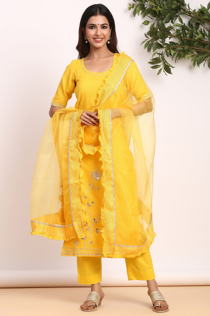 This Lurex Sunshine Yellow Suit Set is the perfect choice for any special occasion. This stunning set is crafted from a cotton lurex with gold weaving, making it just as luxurious as it is comfortable. The Kurta features a scoop neck and elbow sleeves, while the pencil pant completes the look. The set is further elevated by the Gota Patti Handwork on the panel and Gota finish on the neckline, sleeves and panel. The included organza dupatta comes with a jute finish, and features small frills and Gota finish on all four sides. Bring the sunshine into your wardrobe with this beautiful yellow suit set!