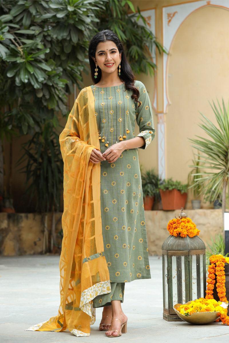 Nothing compares to the charm of elegant cotton suit sets. Look your best in this gorgeous Marigold Cotton Suit Set with Dupatta. This set features a super fine printed cotton Kurta with intricate thread work and tassels on the yoke, 3/4th sleeves with contrast printed flaps and loops, and a boat neck. The matching straight palazzo and satin checks dupatta with printed border on the pallu complete the look. The elegant design and beautiful colours make this set a must-have for all special occasions.