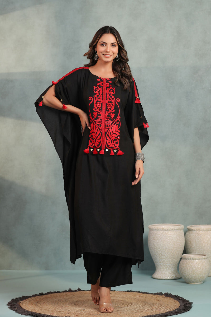 Elevate your style with the Alaya Black Kaftan Set. Featuring export-quality Rayon fabric and intricate Parsi Embroidery, this outfit exudes both fashion and comfort.