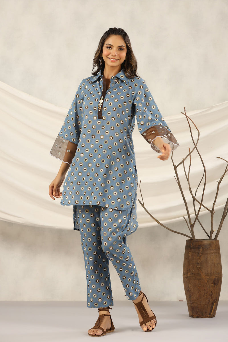 Austin Polka Co-ord Set is the perfect choice for modern women who love to make a statement with their fashion choices. This set features a pure cotton short kurta with a high low hemline, a shirt collar, and a contrast button placket that adds a touch of sophistication to the overall look. The kurta is beautifully embellished with buttons and beads, making it a true statement piece.The slightly bell sleeves are finished with contrast organza and adorned with scallops and embroidery, making this set a true work of art. The attention to detail is evident in every aspect of the design, from the choice of fabric to the embellishments used to enhance its beauty.