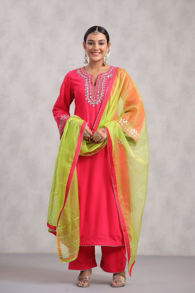 | Kurta Style | Slightly A line kurta embellished with gota patti work on neckline and sleeves. |