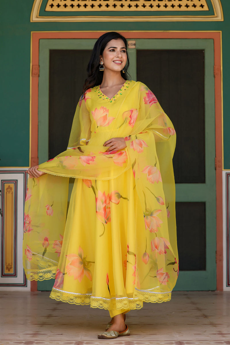 The Canary Yellow Suit Set is a stunning ensemble that will make you look like a million bucks. This set includes stunning organza flared kurta with beautiful sequence work on the neckline, as well as gota and net lace finishes on the hemline. The designer keyhole back is complete with fancy tassels, and it has a cotton silk lining for comfort. The straight pant is also made from cotton silk, and the set is accompanied by a printed organza dupatta complete with gota and net lace finishes on all four sides. Plus, this set features bell sleeves and a V-neck. Show off your style in this elegant and beautiful Canary Yellow Suit Set.