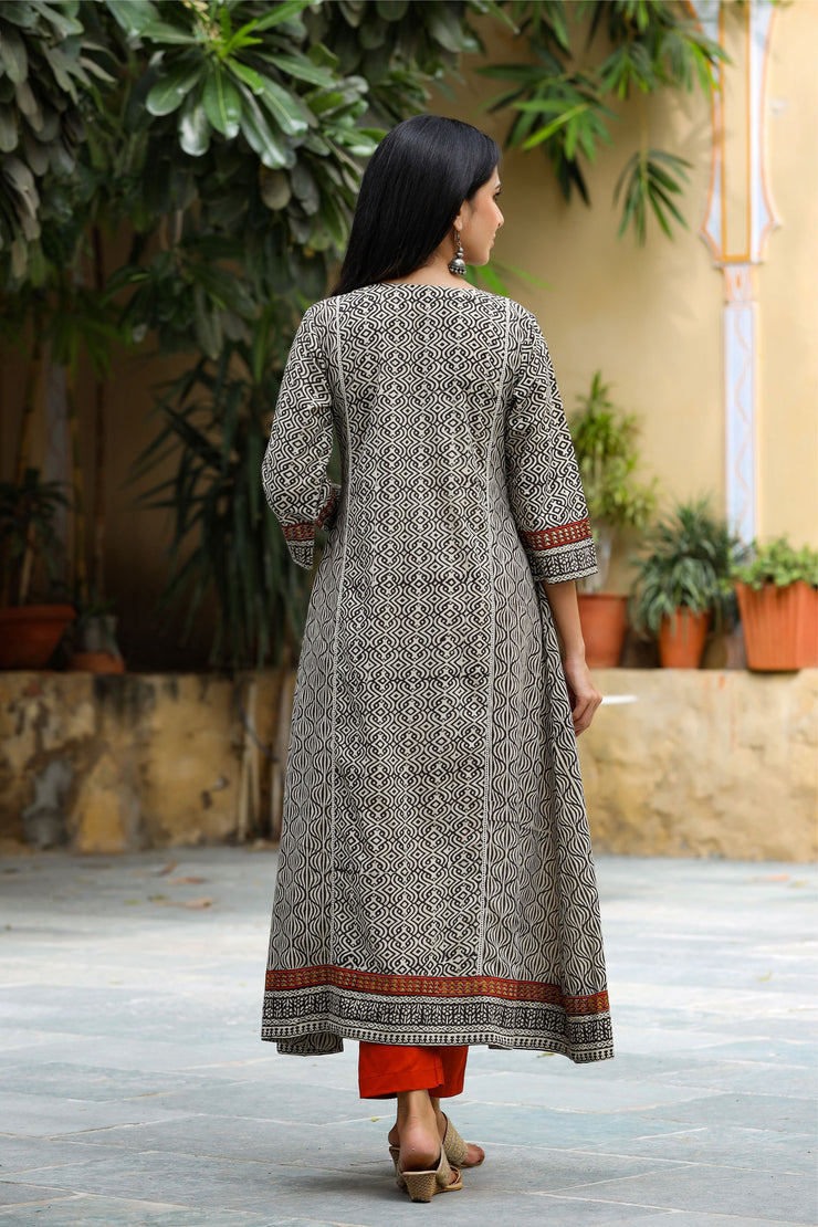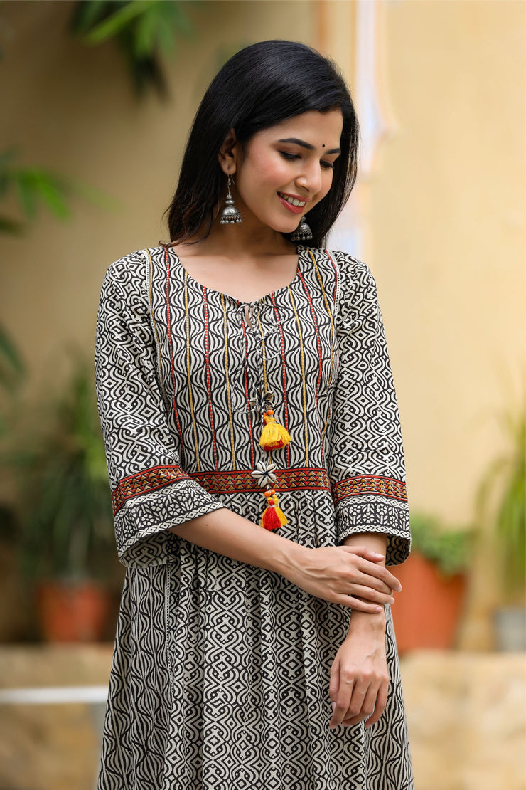 | Kurta Style | Jaipuri Handblock Cotton A Line Kurta, Slightly gathered central panel and contrast thread embroidery on yoke with tassel. Dori on neckline. |