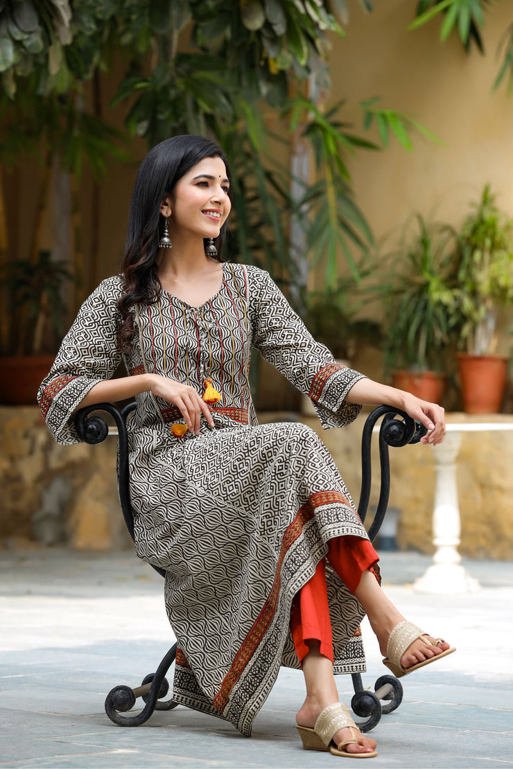 Introducing the Maadhvi Jaipuri Handblock Kurta Pant Set, a beautiful and unique outfit perfect for any occasion. This set features a Jaipuri Handblock Cotton A-Line Kurta with a slightly gathered central panel and contrast thread embroidery on the yoke with tassels. The neckline features a dori, while the 3/4th sleeves provide a comfortable fit. The set is complete with straight cotton pants. Whether you're looking for something special to wear to a party or a casual day out, this Kurta pant set for women is sure to make you stand out in the crowd.