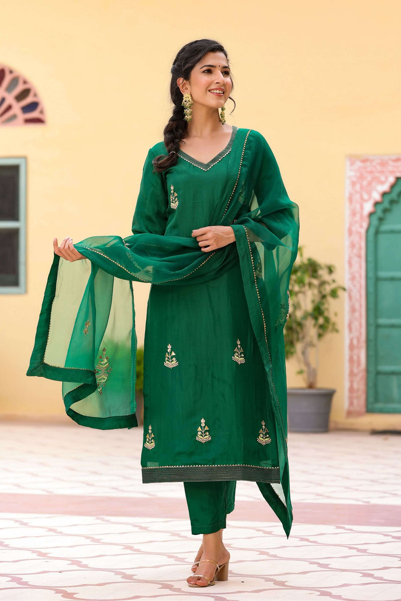 This Pavitra Embroidered Silk Green Suit Set is simply stunning! The kurta is made of luxurious silk and features intricate Gota Patti, thread and pearl work with a zari finish. It has 3/4th sleeves with zari embellishment and a v-neck with zari adornment. The matching pencil pant and pure organza dupatta with silk border are embellished with heavy boota work that adds to the elegance of the ensemble. Whether you're attending a wedding or a formal event, this green suit set women's outfit is sure to make you look and feel your best.