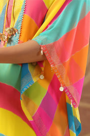 | Katan Style | Georgette Leheriya print kaftan with gold printed borders and yoke embellished with golden ginni tassels |