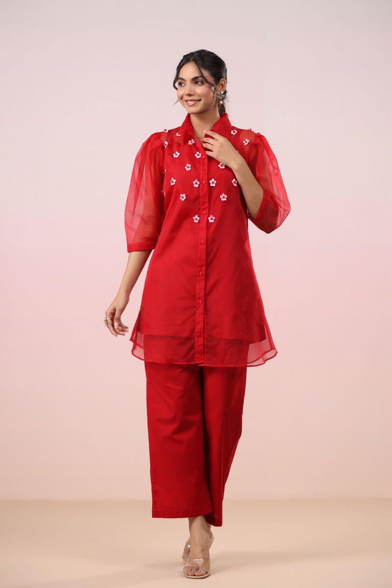 Be a head-turner in the Red Co-ord Set, complete with dazzling embellishments of Hakoba flowers and beads. Perfect for any occasion, from a night out to a romantic date, this set with its collared shirt and puffed sleeves will be your new favourite outfit.