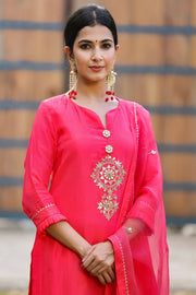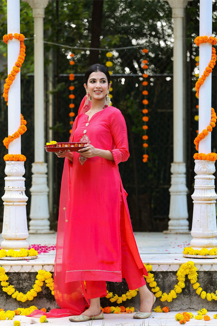 Begin celebrations with Gillori Silk Gota Patti Suit Set with Dupatta. Rich Pure Organza dupatta with all over embroidery and Silk border gives it a posh classy look.