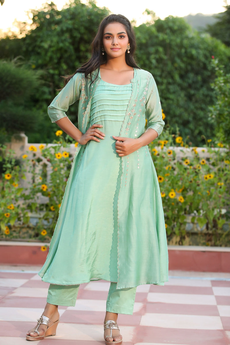 Get ready to turn heads in this luxurious, three-piece designer jacket dress. This beautiful and unique three-piece ensemble is perfect for any special event. The A-line front open pure Chanderi jacket has off-gold sequin embroidery and scalloped sleeves and front sleeves. The inner is an A-line side closed Santoon Silk inner with lining and flat pintucks on the front yoke. Get your Three Piece Designer Jacket Dress from Gillori today!