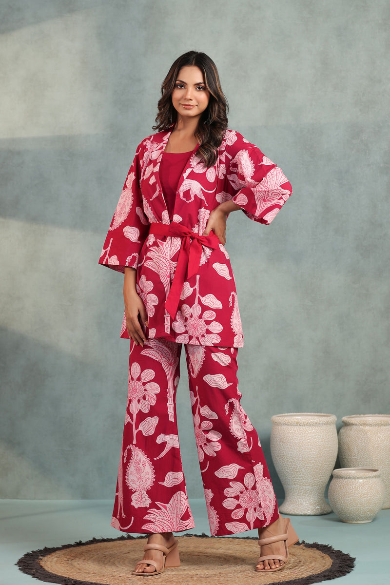 Level up your fashion game with this beautiful three-piece ensemble that is sure to make heads turn. The set includes a jacket, spaghetti top, and straight pant, all crafted with export quality premium cotton to ensure maximum comfort and durability. The front open jacket features a notch collar and bell sleeves, adding a touch of elegance to the overall design. The pure cotton blouse length spaghetti comes with back elastics and strap adjusters, allowing for a perfect fit every time. The Victoria Co-ord Set is designed in a beautiful onion color with intricate prints, making it a perfect choice for any occasion.